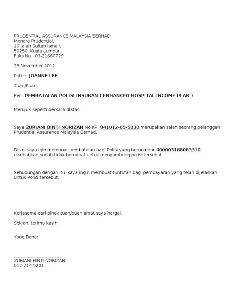 Contoh Surat Pembatalan Polisi Insurans Takaful Ikhlas